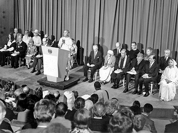 From an interfaith programme "One is the Human Spirit" marking the 30th anniversary of the United Nations, 1975: after opening remarks by Secretary-General Kurt Waldheim, Sri Chinmoy offers the opening meditation, as Mother Teresa and other participants look on.