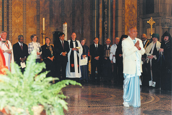 Sri Chinmoy offers a meditation at an interfaith ceremony in honour of the United Nations, with UN Secretary-General Kofi Annan as guest of honour.
